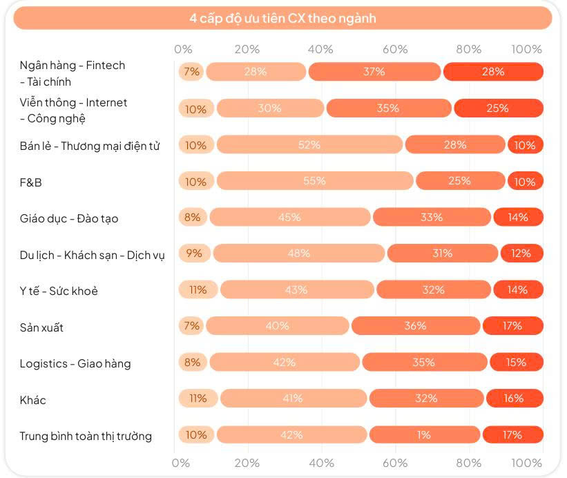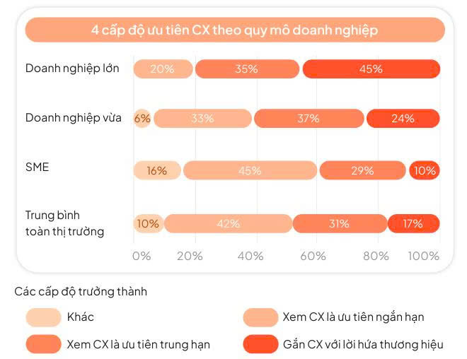 Khảo sát hơn 1.000 doanh nghiệp và 1.000 người tiêu dùng cho thấy sự chênh lệch rõ rệt giữa cách doanh nghiệp tổ chức trải nghiệm và cách khách hàng cảm nhận. Chưa đến 40% doanh nghiệp có bộ phận chuyên trách về CX, phần lớn vẫn giao kiêm nhiệm cho chăm sóc khách hàng hoặc tiếp thị. Khi không có một “chủ sở hữu” chịu trách nhiệm cho toàn bộ hành trình, trải nghiệm bị chia cắt thành nhiều điểm chạm rời rạc, mỗi phòng ban xử lý một phần, nhưng không ai chịu trách nhiệm cho kết quả cuối cùng.